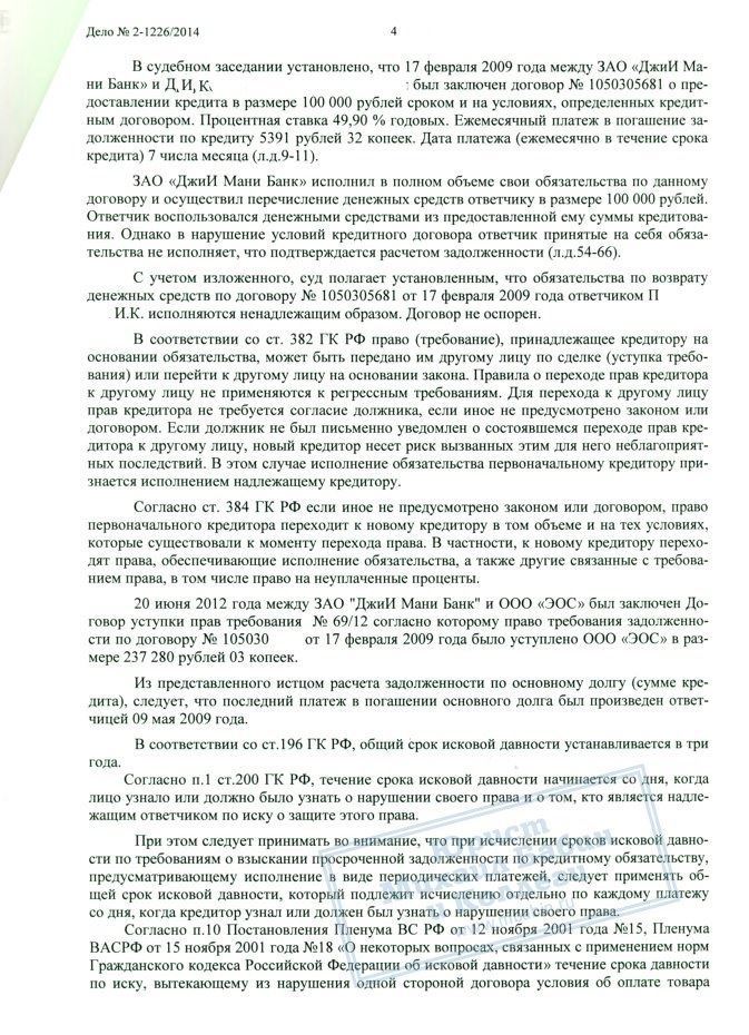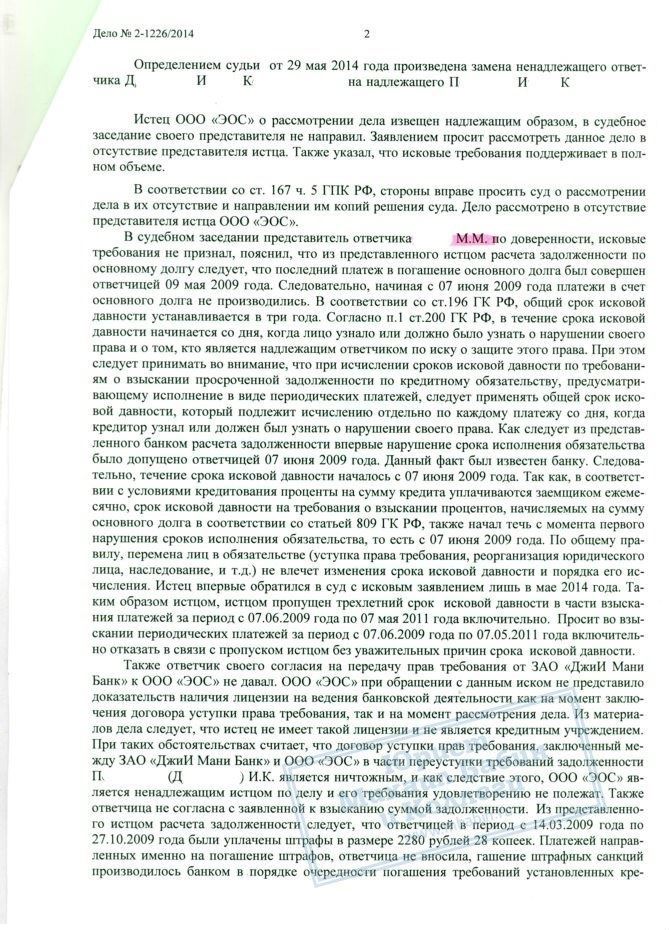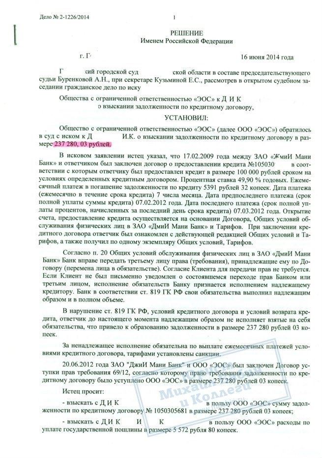 Оспорена сумма задолженности коллекторскому агентству ООО «ЭОС» в связи с пропуском срока давности. Сумма долга в судебном порядке уменьшена с 237.000 до 60.000 рублей.