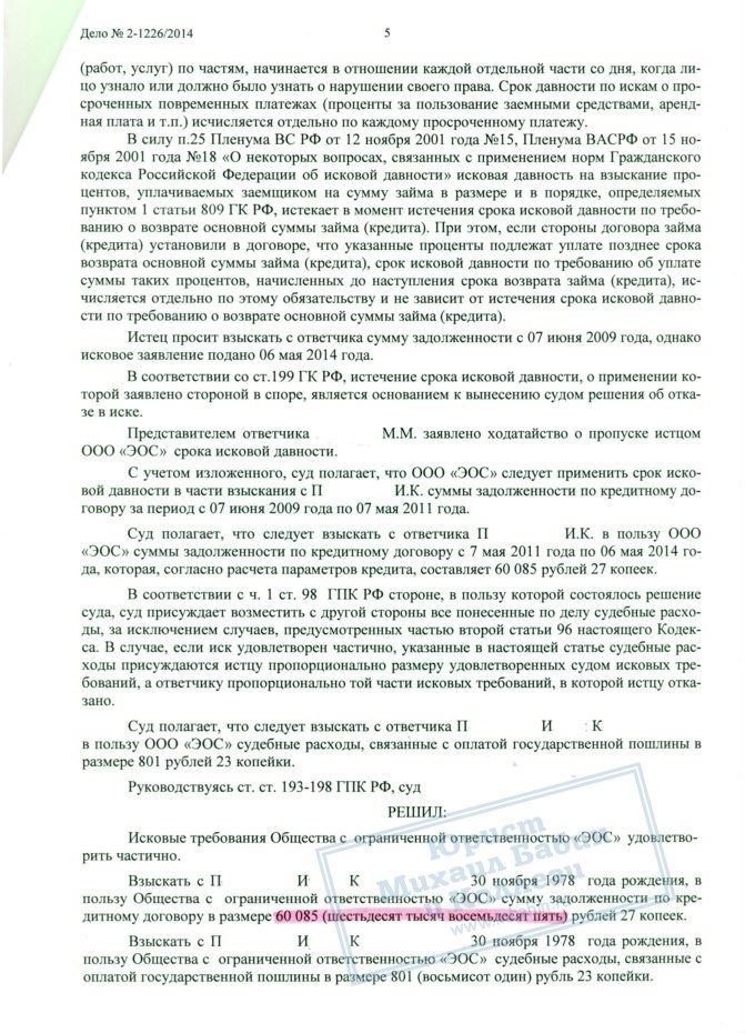 Интересы Д. в суде защищал юрист нашей компании, который выяснил, что с момента последней выплаты по основной части долга прошло более 3 лет, таким образом был пропущен срок давности, оговоренный Законом РФ.
