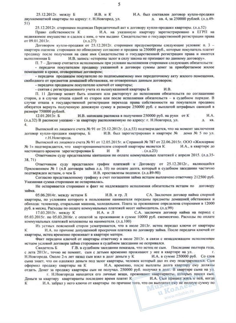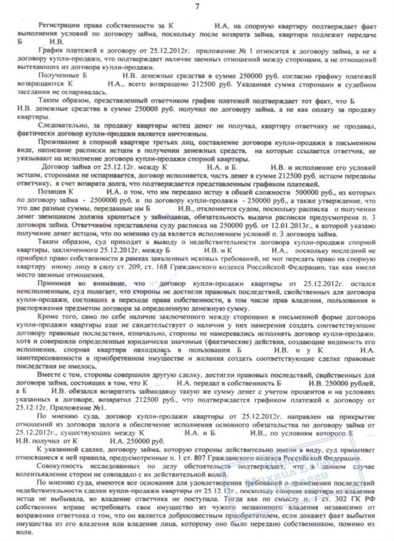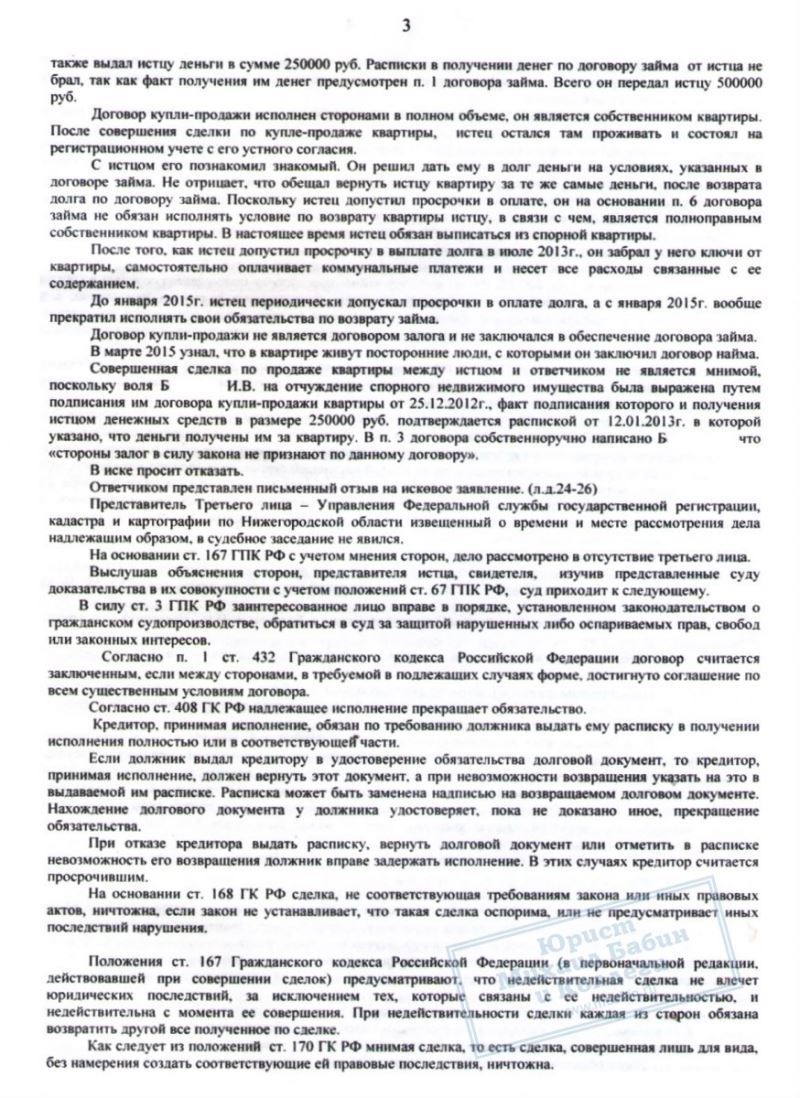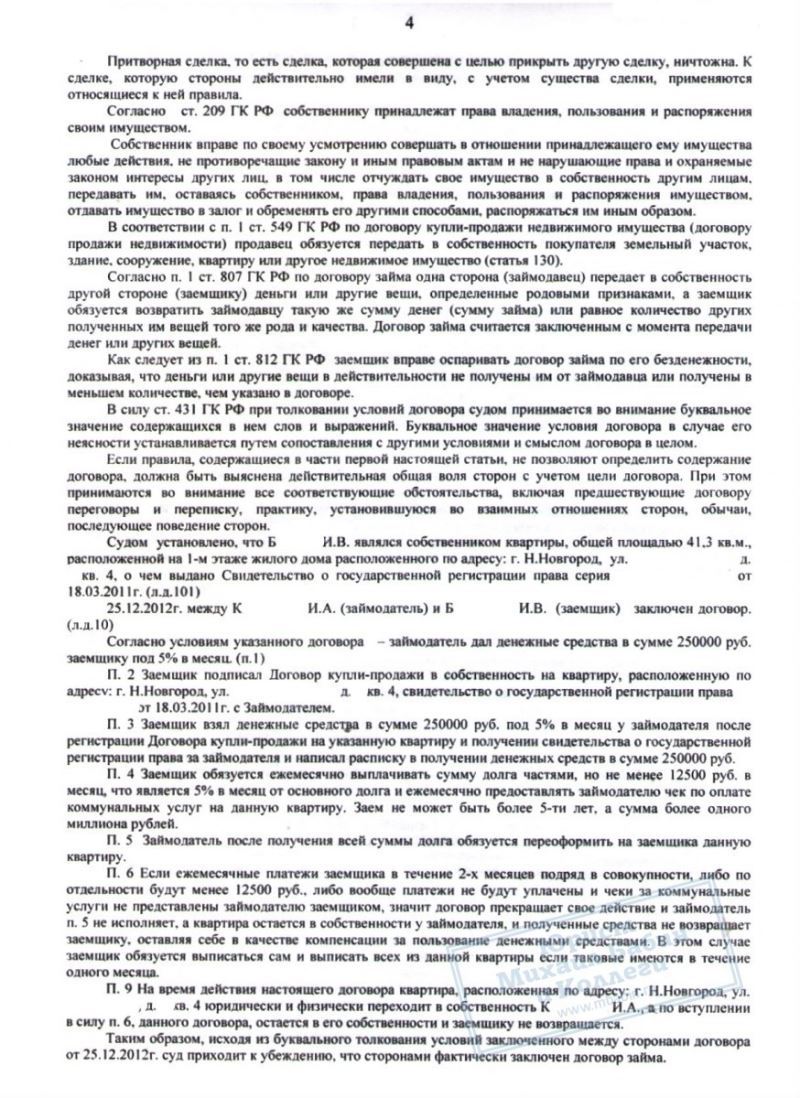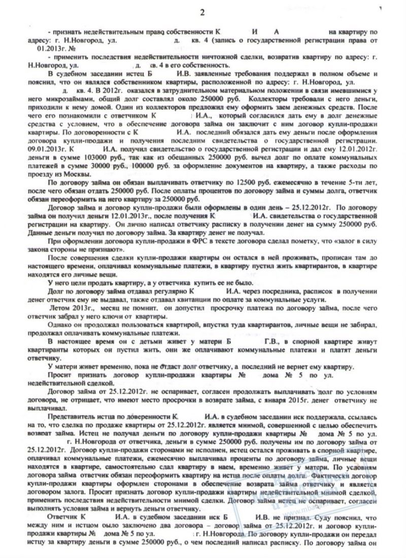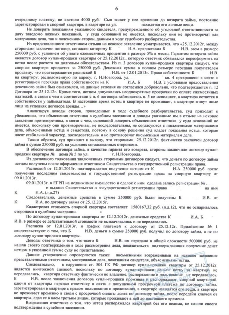 Наш клиент Б. попал в затруднительную ситуацию, связанную с просрочкой кредитов, и, находясь под давлением коллекторов, пошёл на опасную сделку. Он взял новый займ в 250.000 руб. на погашение кредитов, и оформил на представителя микрофинансовой организации свою квартиру. Предполагалось, что после выплаты долга и процентов, квартира будет ему возвращена. Однако, новый владелец посчитал, что вправе оставить жильё себе.