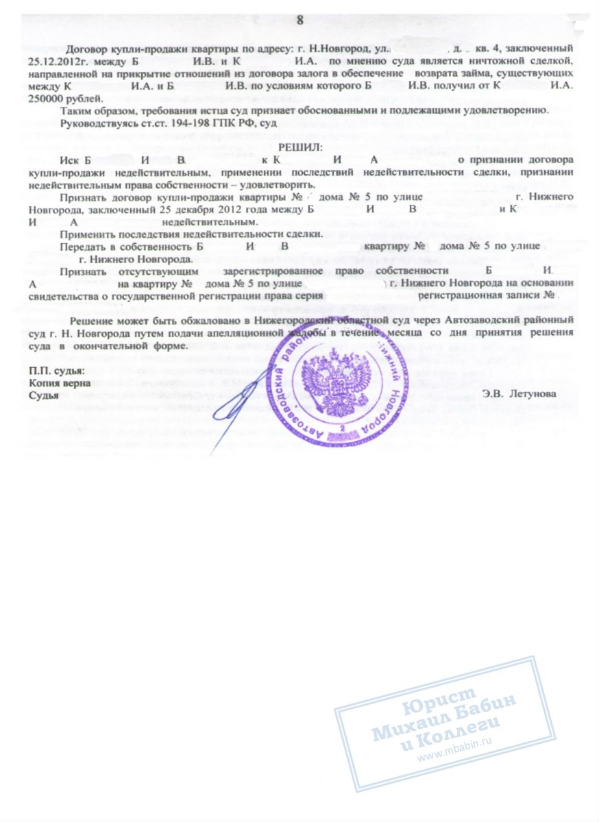 На суде наш юрист смог доказать, что фактически между клиентом и ответчиком был заключен мнимый договор купли-продажи квартиры. В результате, суд вернул спорную квартиру в собственность Б.