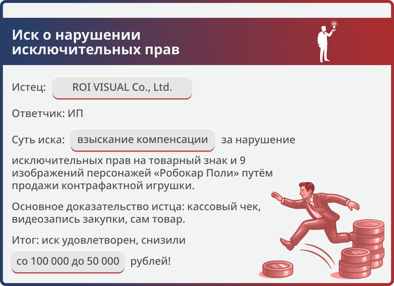 Истец (ROI VISUAL Co., Ltd., Республика Корея) обратился в суд с иском к ИП о взыскании 100 000 руб. компенсации за нарушение исключительных прав на товарный знак и 9 произведений изобразительного искусства — изображения персонажей анимационного сериала «Робокар Поли» (Эммер, Хэлли, Поли, Рой, Марк, Баки, Скул Би, Брунер, Дампу). Основание — продажа в торговой точке ответчика контрафактной игрушки, содержащей указанные обозначения. Ответчик представил отзыв с возражениями и заявил о снижении компенсации. Дело рассмотрено в общем исковом порядке.