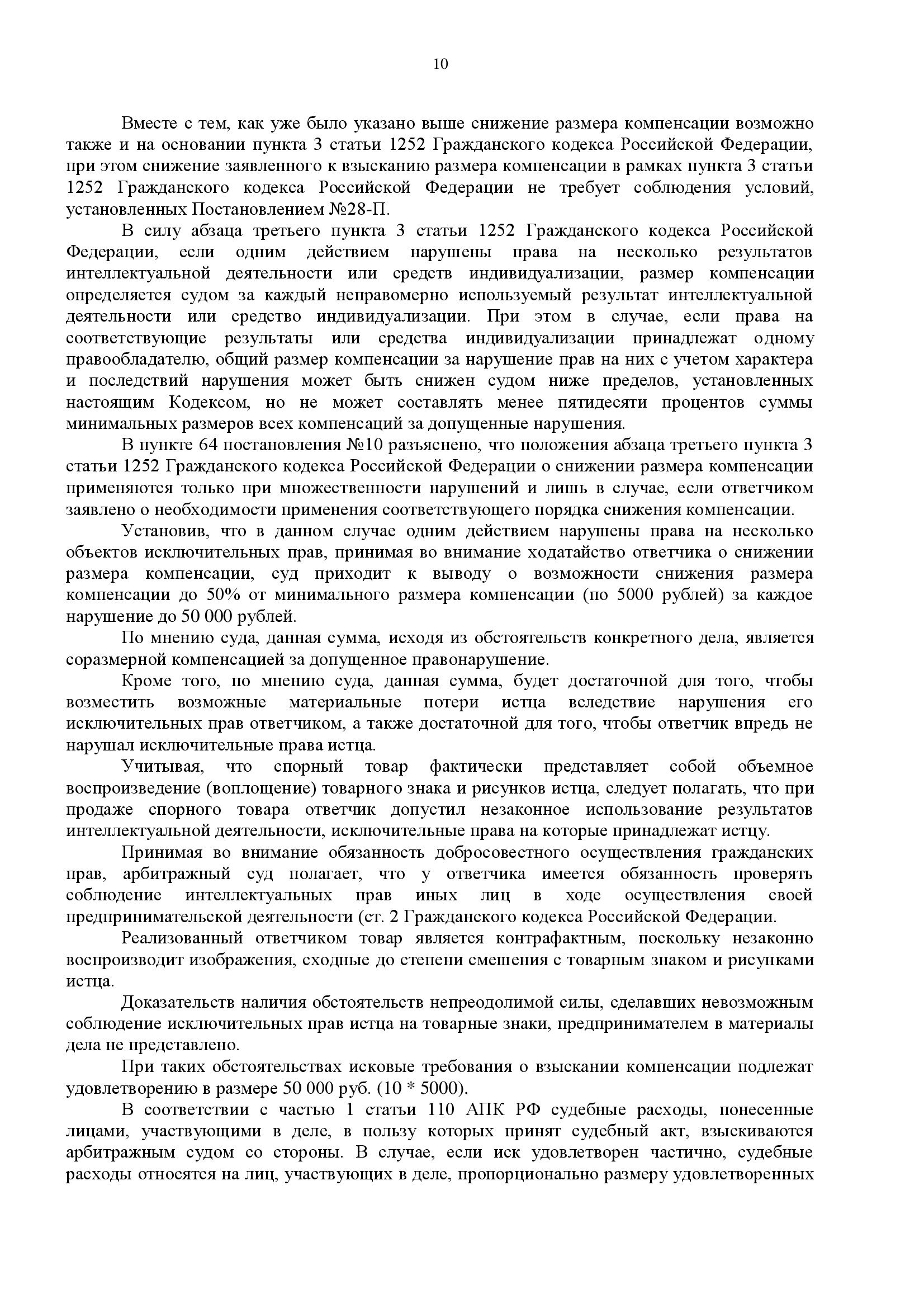 Дело наглядно показывает эффективность применения пункта 3 статьи 1252 ГК РФ при множественности нарушений одним действием. Даже при наличии у истца 10 объектов интеллектуальных прав, грамотное обоснование позволило снизить итоговую компенсацию вдвое — со 100 000 до 50 000 руб.