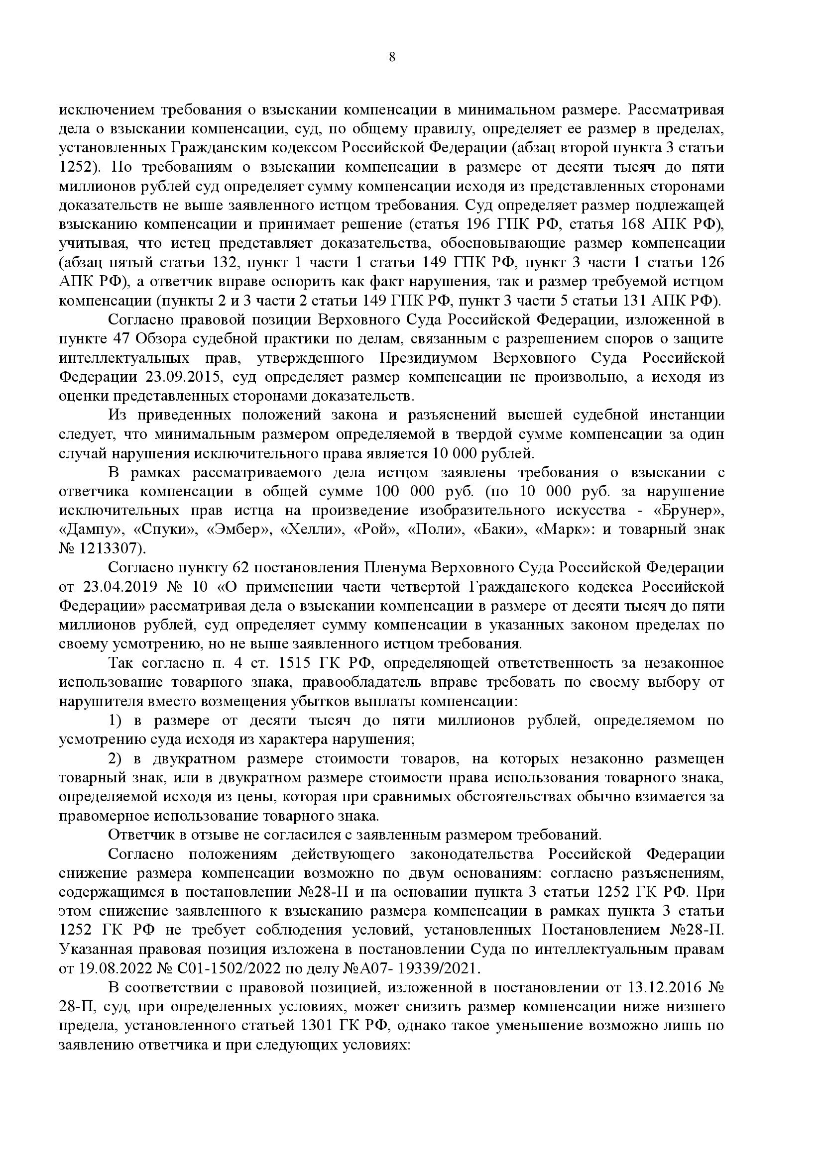 Защита настаивала на применении абзаца 3 пункта 3 статьи 1252 ГК РФ, согласно которому при нарушении одним действием прав на несколько объектов, принадлежащих одному правообладателю, общий размер компенсации может быть снижен судом ниже минимальных пределов, но не менее 50% от суммы минимальных размеров всех компенсаций. Также обращалось внимание на то, что истец не обосновал известность персонажей российскому потребителю и возможные убытки, а ответчик ранее привлекался к ответственности, что исключало снижение ниже 50%.