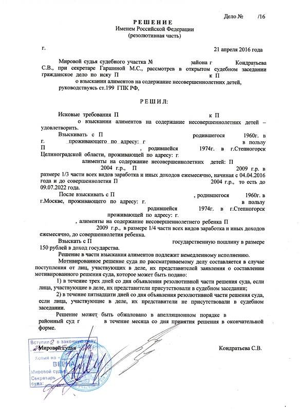 Решение о взыскании алиментов