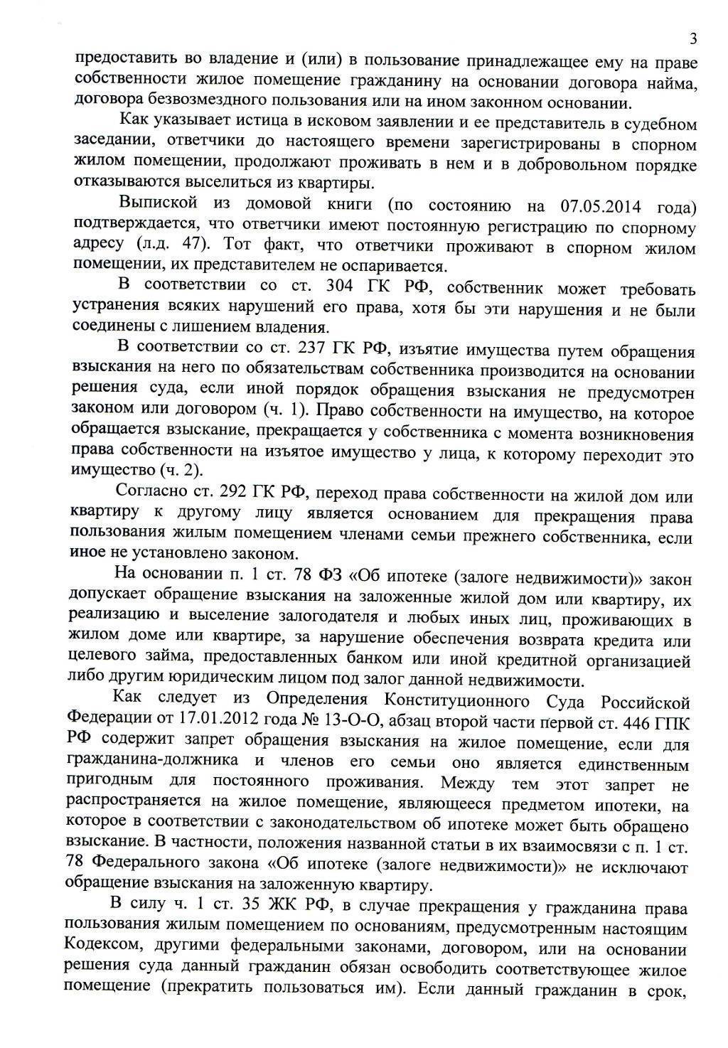 Перед заключением сделки купли-продажи было оговорено, что лица, проживающие на момент подписания договора, после перехода права собственности на квартиру истице будут отсутствовать. Однако ответчик и члены его семьи отказались добровольно покидать квартиру. В связи с этим истица вынуждена была обратиться в суд.
